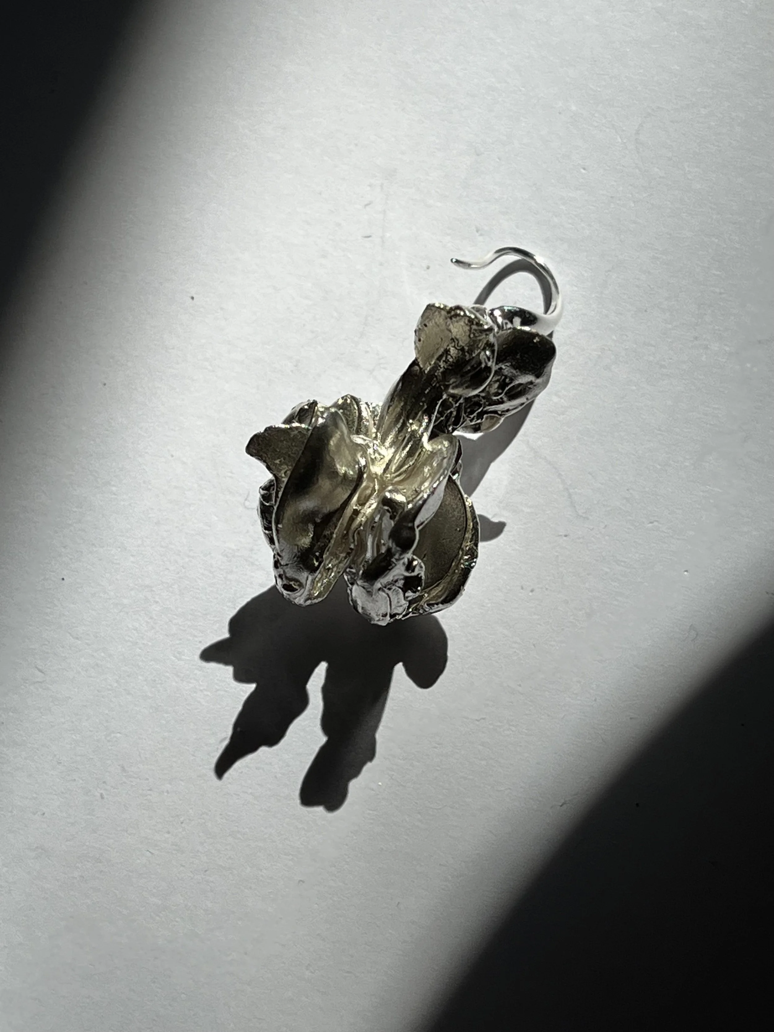 The shape of ‘Apple Core Sterling Silver Hook Mono Earring’ takes its inspiration in dried bitten apple cores. Hand-crafted in lost wax technique and moulded in Sterling Silver 925. Made in London. Polished in Paris.
