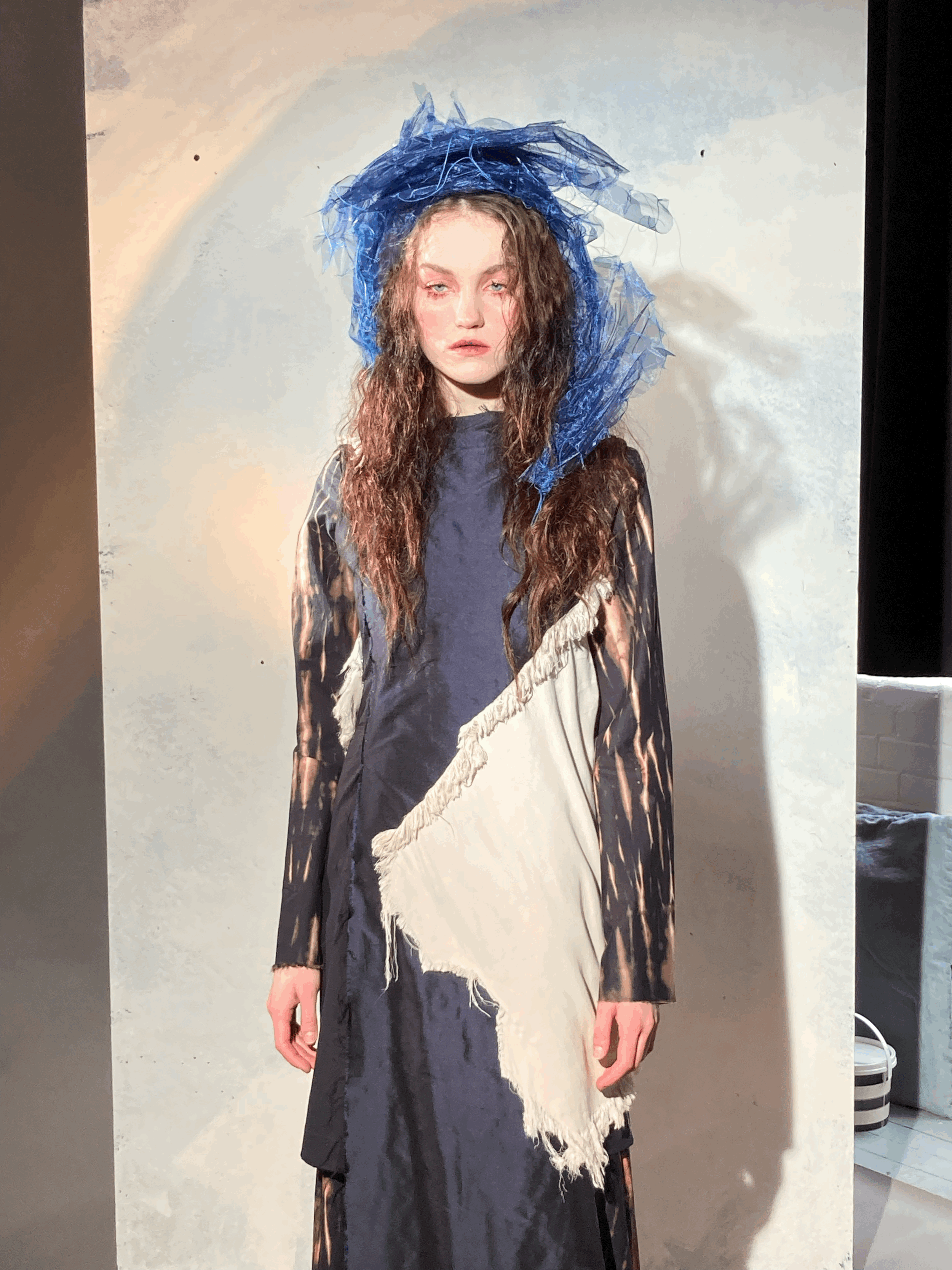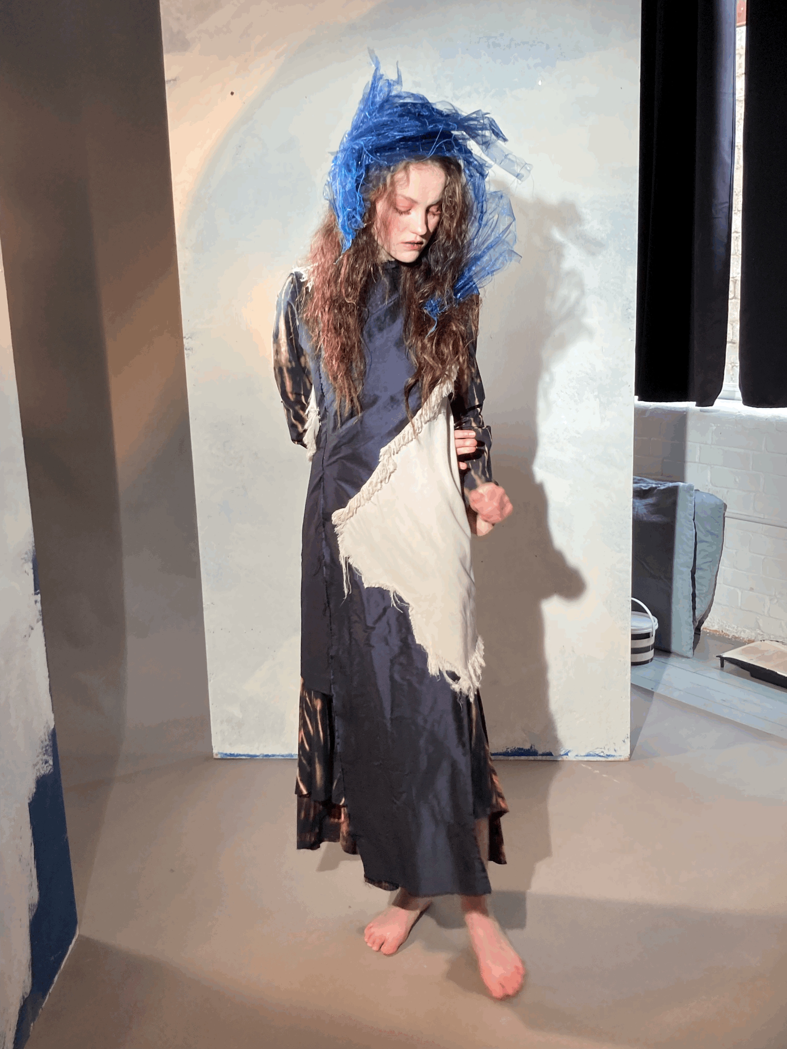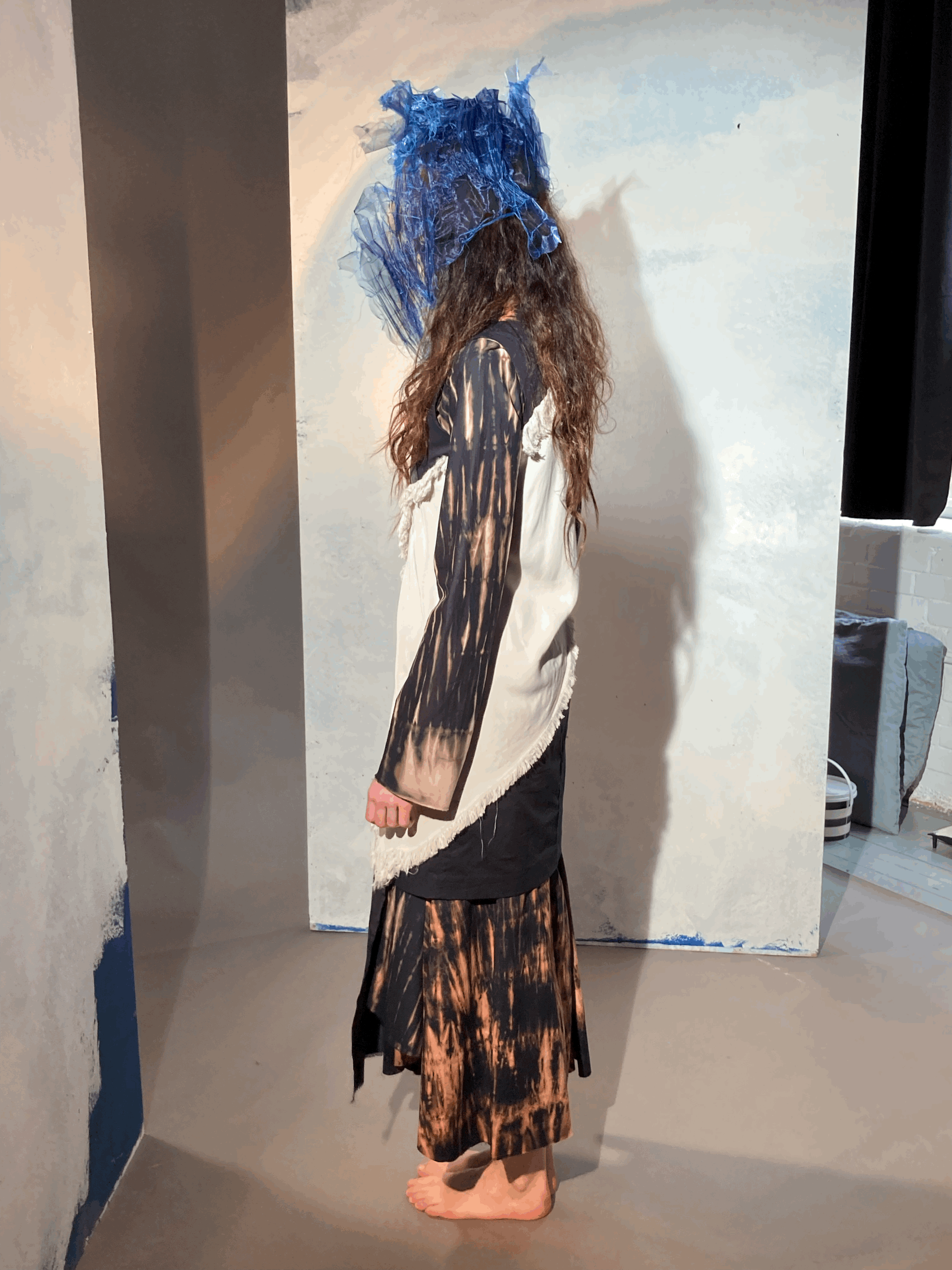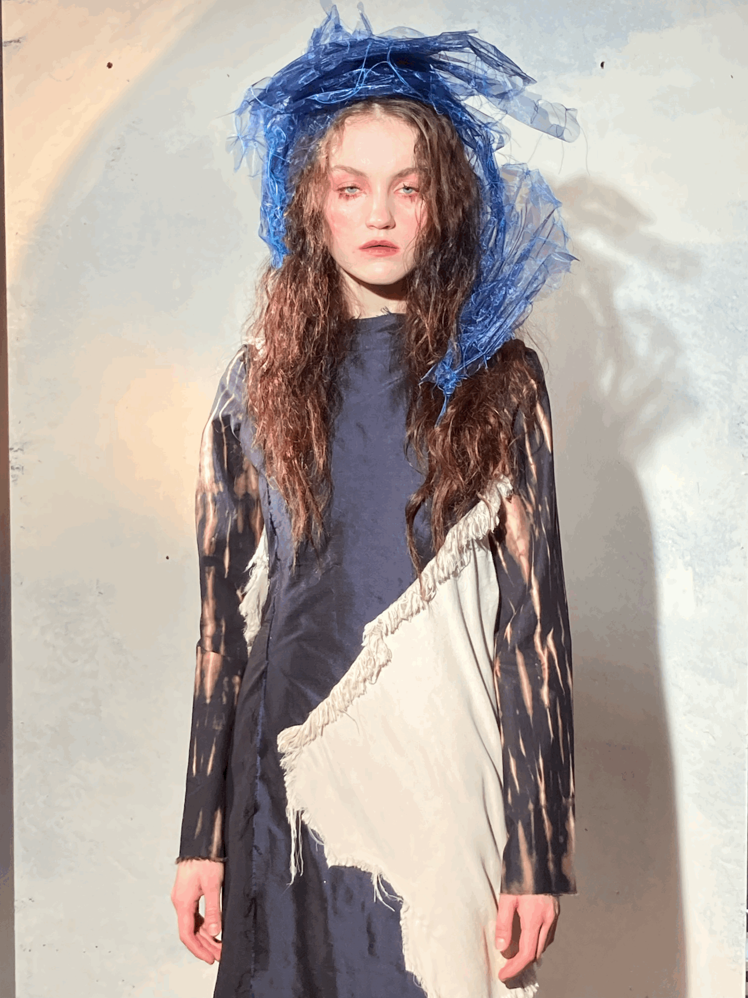 ‘The Canvas’ is a third look of ‘Insomnia’ artisanal collection created in 2022. It is a two-piece set, consisting of a hand-stitched black cotton overdress with navy silk and a gray frayed twill fabric and a raw bleached black cotton underdress. Stone grey cotton is wrapped around the body, resembling the holy body of Madonna. Handmade in Paris.