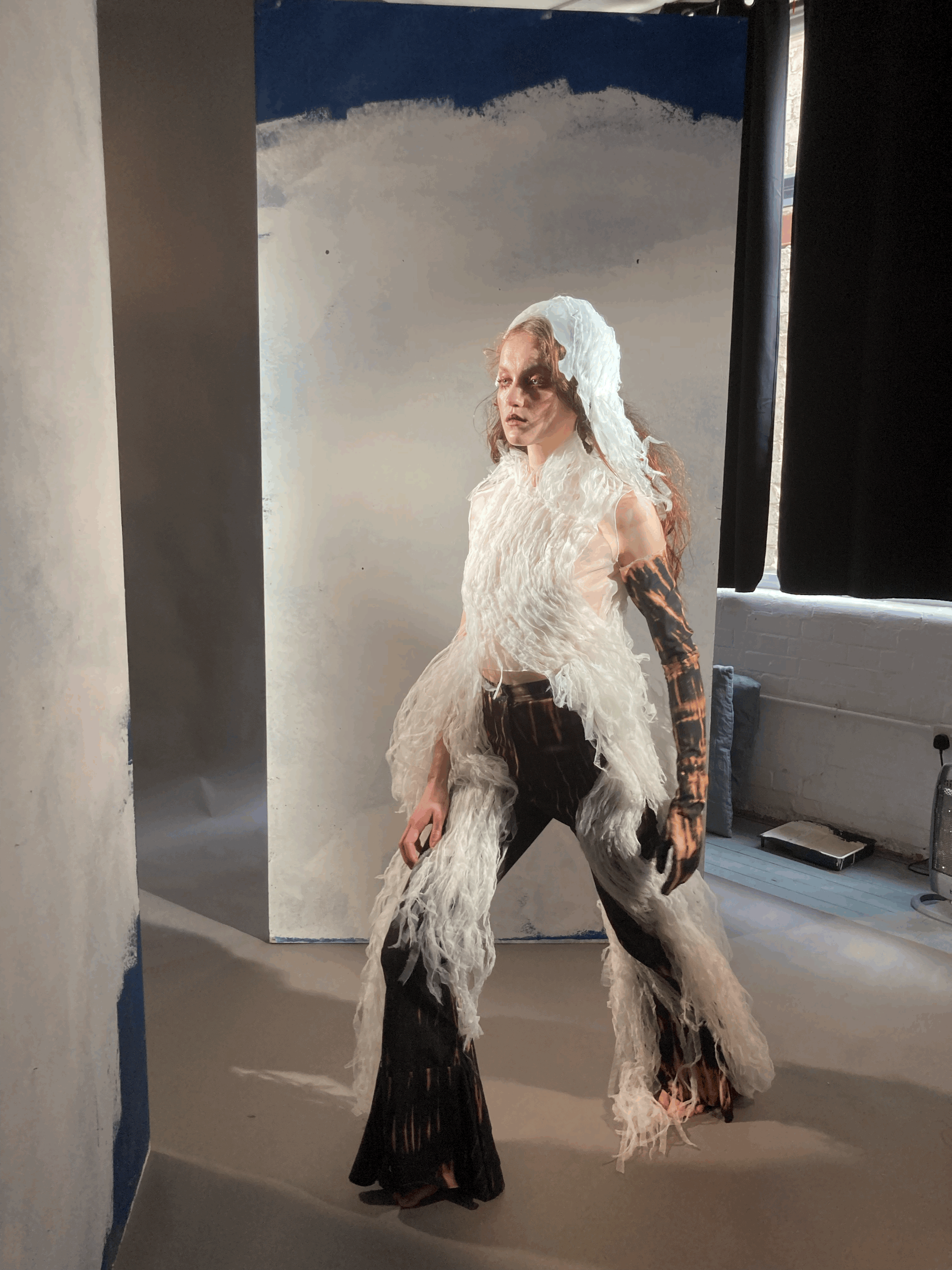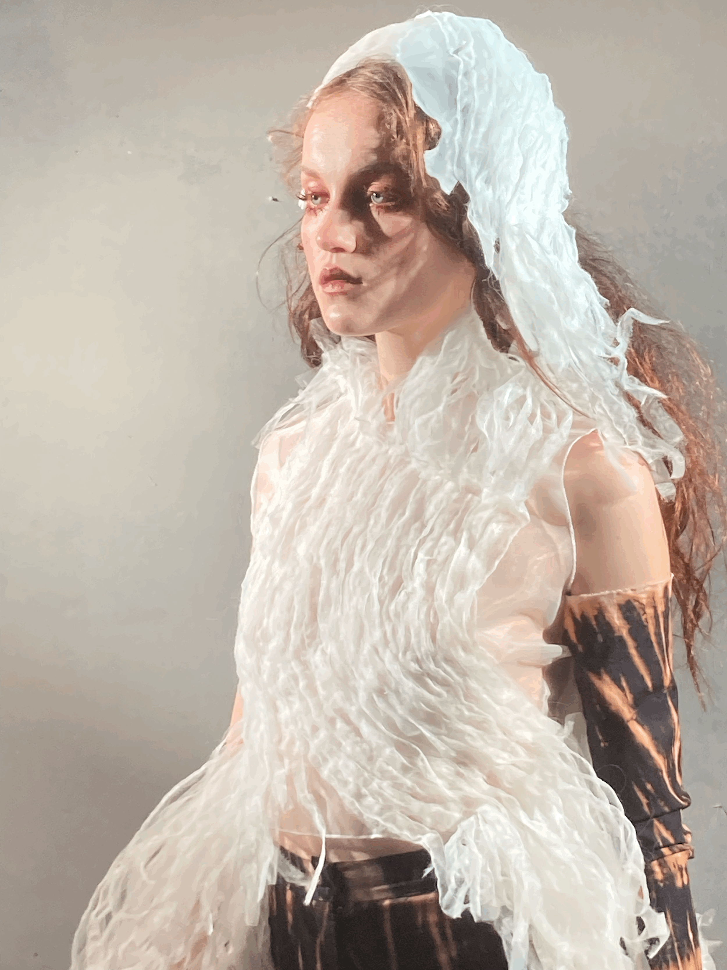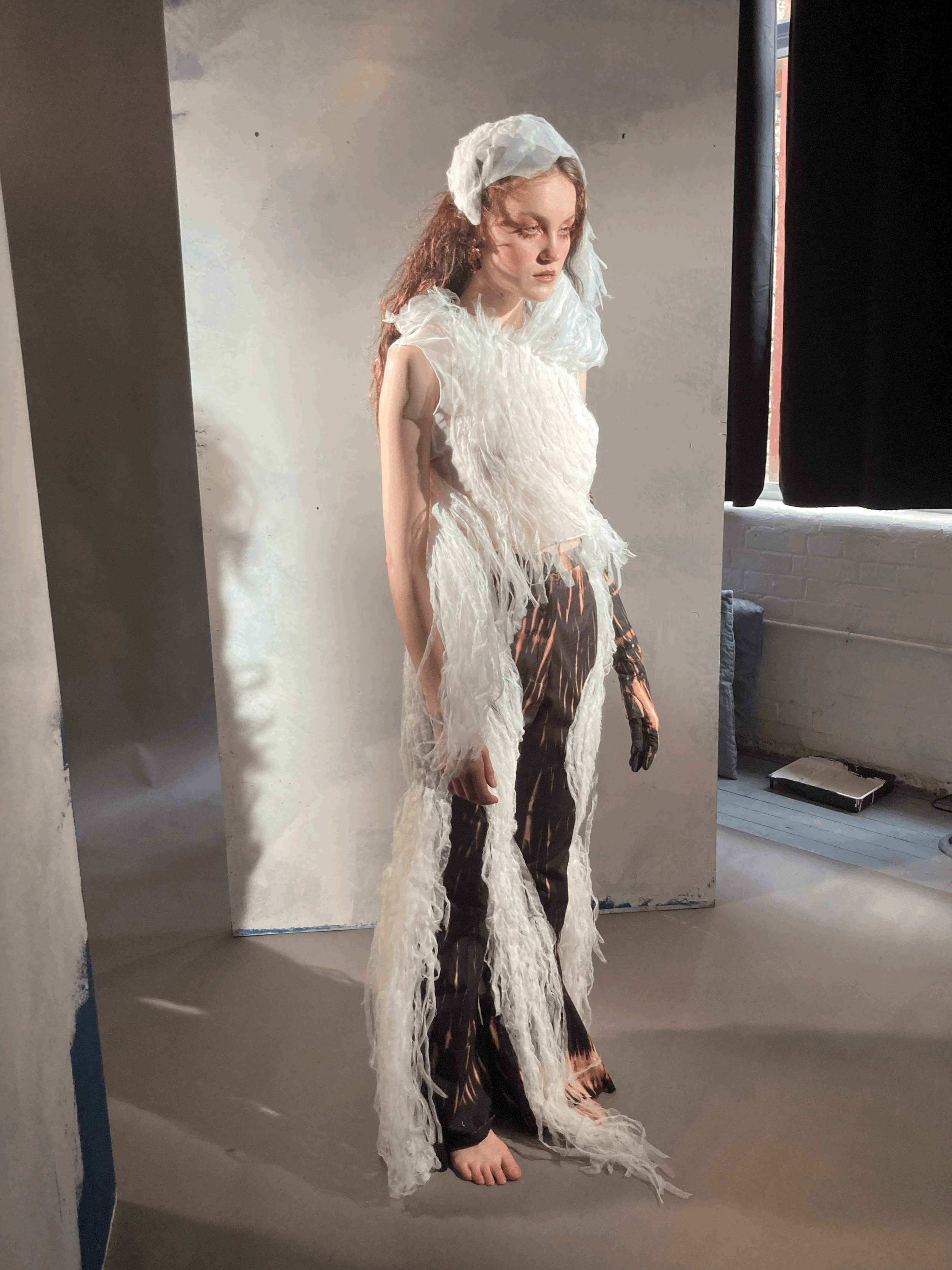 ‘The Night’ is a fifth and final look of ‘Insomnia’ artisanal collection created in 2022. It is a hand-stitched two piece set, consisting of a transparent white organza top and hand-bleached trousers. The pieces were made with a shivering organza curtain ripped in strips during one of the sleepless nights. It wraps around the body in distress, suffocating the wearer to sleep. Handmade in Paris.